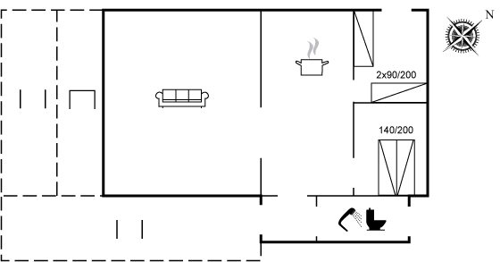 Das Haus ist mit offenen Decken gestaltet und verfügt über 2 geräumige Schlafzimmer, eine offene Küche sowie ein Wohnzimmer mit u. a. Kaminofen. Vom Wohnzimmer aus habt ihr Zugang zur Terrasse, wo ihr die stillen Abende mit gutem Essen vom Grill genießen könnt.