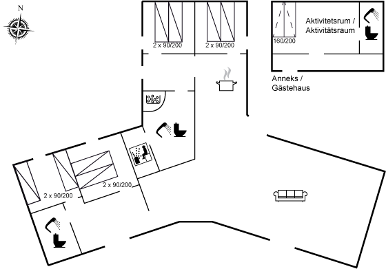 In diesem von einem Architekten gezeichneten Ferienhaus, 2014 gebaut, mit 202 m2 Wohnfläche findet ihr eine durchdachte Raumaufteilung mit einem großen Gemeinschaftsbereich und drei separaten Schlafbereichen – mit Platz für insgesamt 18 Personen. Die Schlafplätze verteilen sich auf 3 Zimmer mit Doppelbett, 1 Zimmer mit 2 Einzelbetten, 1 Gästehaus mit Doppelschlafcouch sowie 2 offene Obergeschosse mit insgesamt 8 Schlaplätzen (4 Boxspringmatratzen und 4 hochwertige Schaumstoffmatratzen). Beide offene Obergeschosse haben etwa 20?m² Grundfläche und eine gute Stehhöhe von ca. 190?cm bis zum Giebel.