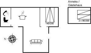 Auf einem Grundstück im Wald - nicht weit von einem kinderfreundlichen Sandstrand entfernt liegt dieses kleine Ferienhaus. Das Haus wurde 2017 modernisiert - mit u.a. neuer Küche sowie neuem Schlafzimmer im Gästehaus, das mit 2 Einzelbetten eingerichtet ist (siehe Grundriss). Vom Wohnzimmer haben Sie direkten Zutritt zur Terrasse. Auf dem Grundstück gibt es einen Pavillon in dem Sie u. a. die schönen Sommerabende genießen können.