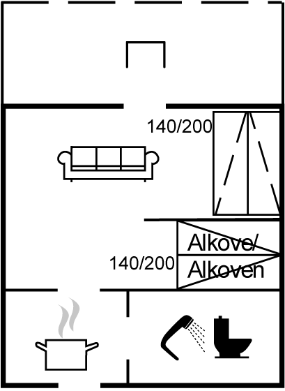 In Dueodde Feriepark, in der Nähe der weitläufigen Sandstrände, befindet sich diese Ferienwohnung, die gepflegt und freundlich eingerichtet ist. Im Wohnzimmer findest du die Schlafplätze der Wohnung, aufgeteilt auf einen Alkoven und eine Doppelschlafcouch. Darüber hinaus gibt es eine kleine Küchenzeile sowie ein Badezimmer.