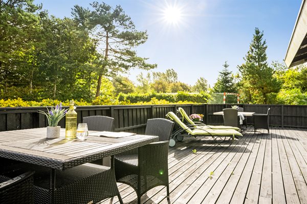 Ferienhaus bei Oksbøl, auf einem teils abgeschirmten Rasengrundstück mit großer Holzterrasse mit Gri...