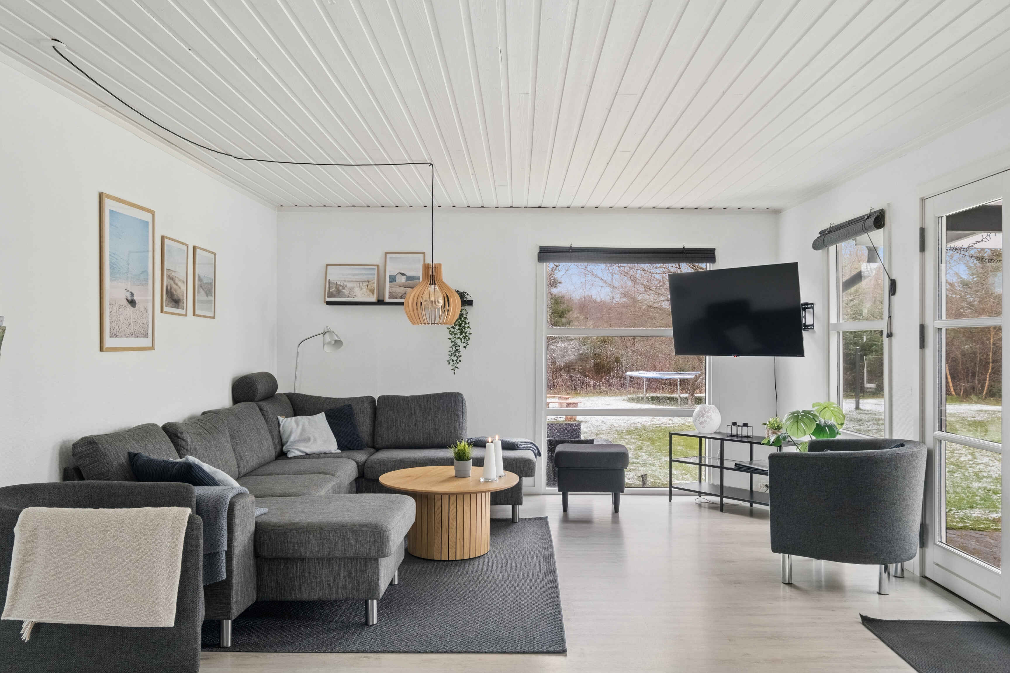Dieses helle und komfortabel eingerichtete Ferienhaus liegt auf einer Anhöhe mit Blick auf den Hjarb...