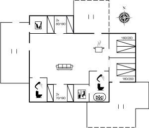 Bitte beachtet jedoch, dass die 4 Einzelbetten 10 Zentimeter kürzer und schmaler als Standardmaße sind, sodass das Haus nicht für 8 große Erwachsene geeignet ist. Schaut euch gerne den Grundriss mit den genauen Maßen für alle 8 Schlafplätze an.