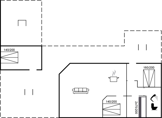 Das Sofa lädt zum Entspannen ein – mit dem Knistern des Kaminofens im Hintergrund. Zum Ferienhaus gehört auch ein gemütliches Gästehaus mit Doppelbett und viel Platz. Es ist der perfekte Ort für Teenager oder auch ein idealer Rückzugsort mit einem guten Buch, wenn du mal eine kleine Pause vom Beisammensein brauchst.