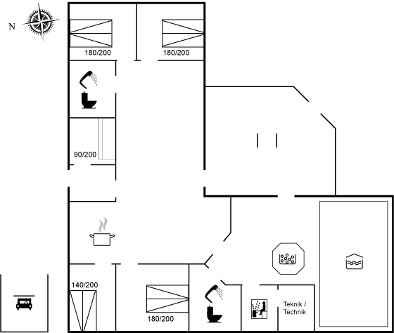 Herrliche Poolabteilung mit Swimmingpool (5,9 x 4,0 x 1,3 m), integriertem Whirlpool für 4–5 Personen (Standwasser) und Badezimmer mit Duschnische und Fußbodenheizung. Zusätzlich gibt es ein schönes, weiteres Badezimmer mit Duschnische und Fußbodenheizung. Die Schlafplätze verteilen sich auf 5 Zimmer: 4 mit Doppelbett und 1 mit Etagenbett.