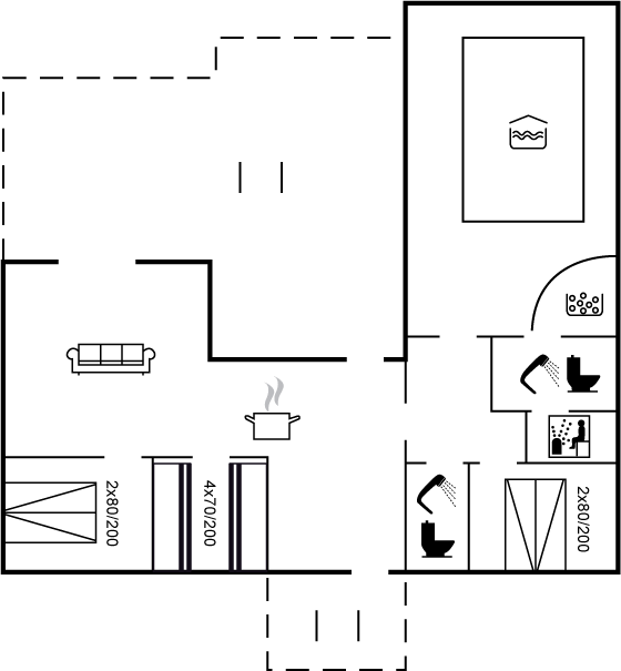 Der unbestrittene Mittelpunkt des Hauses ist der Poolbereich mit dem 18?m² großen Swimmingpool. Vom großen Wohnbereich – einer Kombination aus Küche und Wohnzimmer – hast du Zugang zu zwei Terrassen, auf denen du den ganzen Tag die Sonne genießen kannst.