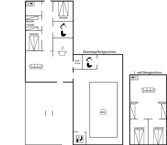 Das Haus ist mit 2 Wohnzimmern eingerichtet, von denen sich das eine im Obergeschoss befindet, wo Sie ebenfalls 2 der insgesamt 5 Schlafzimmer sowie 2 Schlafplätze in je einem Alkoven finden.