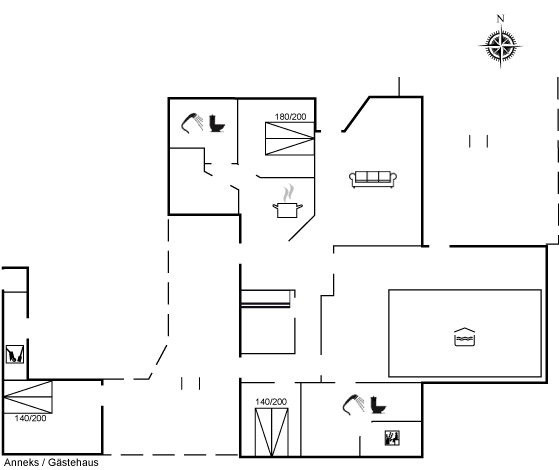 Schönes Ferienhaus auf einem grossen Grundstück nur 250 m von gutem, kinderfreundlichem Sandstrand entfernt gelegen. Zum Haus gehört eine offene Terrasse mit Gartenmöbeln und gutem Windschutz sowie eine überdachte Terrasse. Gästehaus mit Doppelbett.