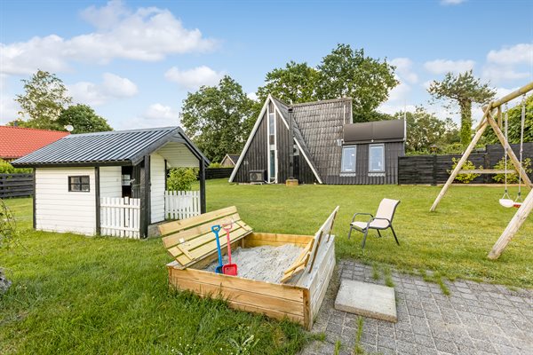 I dette specielle A-sommerhus er der skabt en hyggelig atmosfære, med hyggekroge både inde og ude. Indenfor kan der hygges med spil i den åbne planløsning, mens man nyder varmen fra brændeovnen. Ude kan man grille mens de små leger i legehuset, på gyngestativet eller i sandkassen.