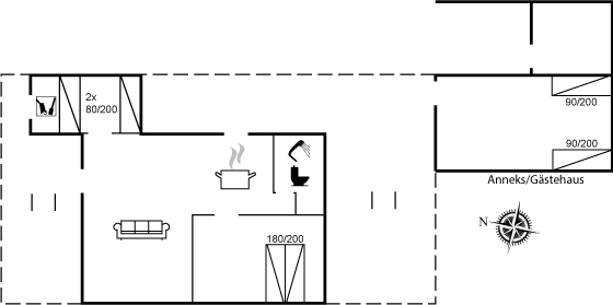 Das Ferienhaus liegt auf einem großen und schönen Grundstück, das sich hervorragend für Ballspiele und das Spielen mit den Kindern eignet. Von den guten Terrassenbereichen, die teilweise überdacht sind, kannst du den ganzen Tag der Sonne folgen und immer eine windgeschützte Ecke finden – hier kannst du die Ruhe in vollen Zügen genießen.