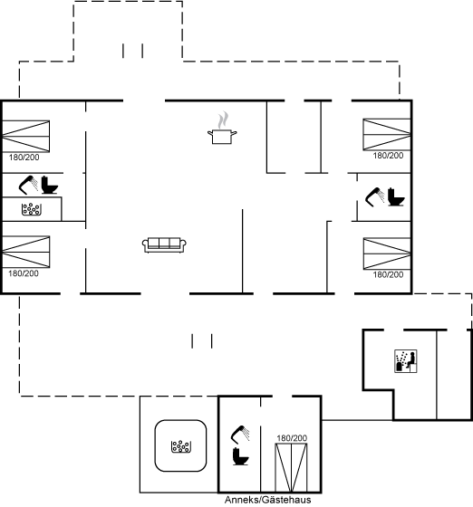 Das Haus hat eine durchdachte Raumaufteilung, die es ideal für zwei oder sogar drei Familien macht, die ihren Urlaub gemeinsam verbringen möchten. Natürlich eignet es sich auch hervorragend für eine Familie, die die Großeltern mit in den Urlaub nimmt. Der Mittelpunkt ist die feine Wohnküche – der perfekte Ort, an dem sich die ganze Familie zur gemütlichen Zeit im Haus versammeln kann. Es gibt außerdem 3 schöne Badezimmer.