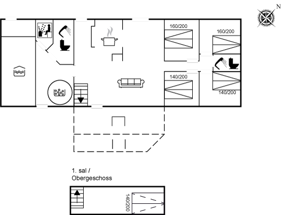 Das Haus ist mit 4 guten Schlafzimmern und einem großen offenen Obergeschoss, mit leichtem Zugang und ausreichender Höhe eingerichtet, sodass genügend Platz für die ganze Familie vorhanden ist. In dem Schlafbereich befindet sich eines der beiden Badezimmer des Hauses. Das zweite Badezimmer liegt im Anschluss an den schönen Pool- und Wellnessbereich. Der Swimmingpool wurde 2023 mit einer neuen, energieeffizienten Wärmepumpe und einem Luftentfeuchter energieoptimiert.