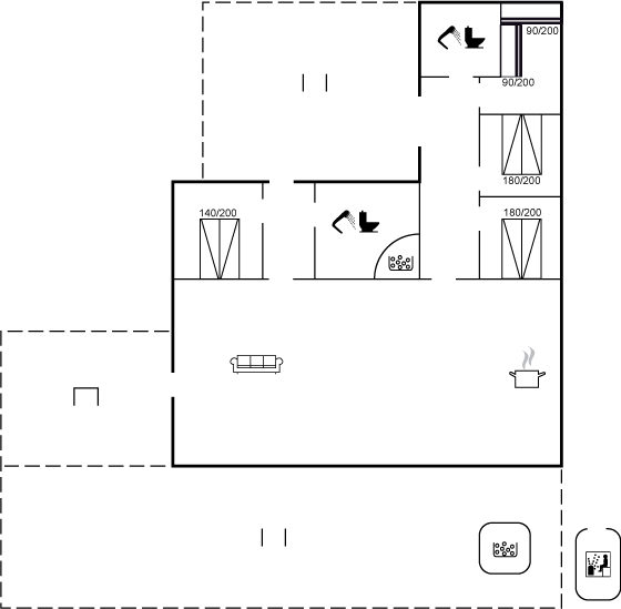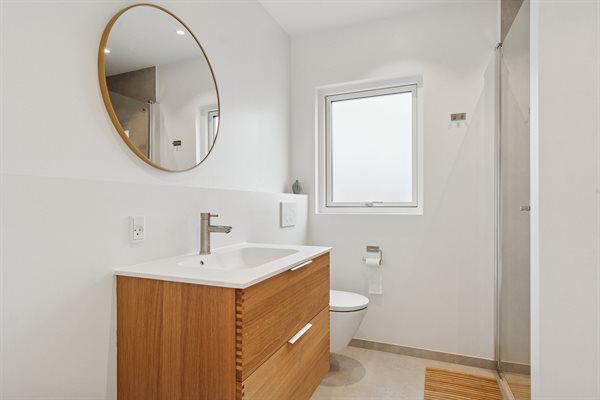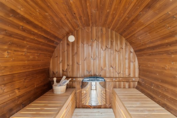 Das Haus verfügt über vier Schlafzimmer und zwei Badezimmer in denselben warmen Materialien. Eines davon ist sowohl mit Whirlpool als auch mit Duschnische ausgestattet. Alles tritt hell und funktional hervor – mit Platz für bis zu 10 Personen.