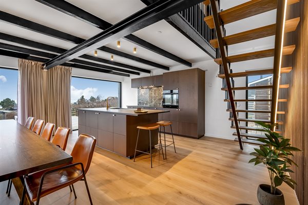 Das Haus ist in zwei Etagen gebaut und verfügt über insgesamt vier gute Schlafzimmer sowie zwei Badezimmer. Im Erdgeschoss erwartet dich ein fantastischer Wohn-Essbereich mit Küche, und im Obergeschoss befindet sich ein gemütliches Wohnzimmer – hier muss der Film im Fernsehen schon besonders gut sein, um nicht von der herrlichen Aussicht abgelenkt zu werden.