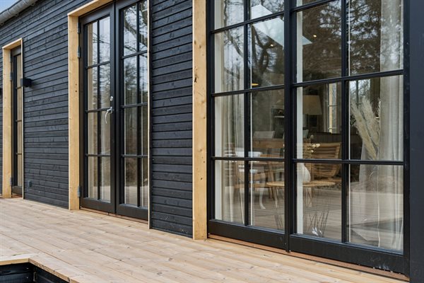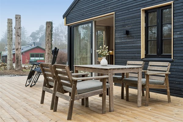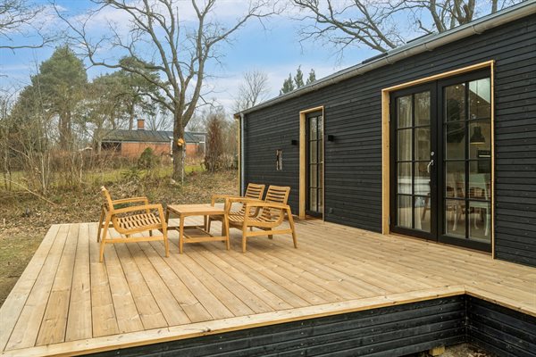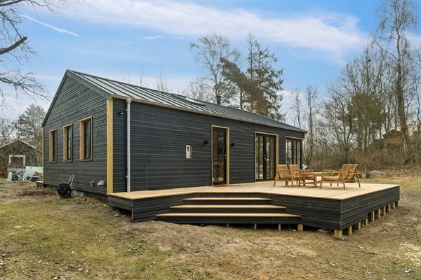 Vom Wohnbereich aus gelangst du direkt auf die große Holzterrasse, die das Haus umgibt und einen natürlichen Rahmen für das Leben im Freien schafft. Das dazugehörige Naturgrundstück bietet Platz für entspannte Stunden als auch zum Spielen in ruhiger Umgebung an.