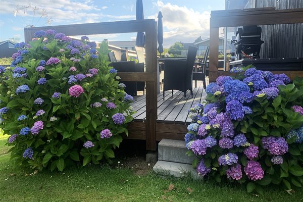 Draußen umgibt die Terrasse das Haus beinahe vollständig und bietet schöne Möglichkeiten, das Leben im Freien von morgens bis abends zu genießen – und das sogar mit Blick auf das Wasser von Hejlsminde.
