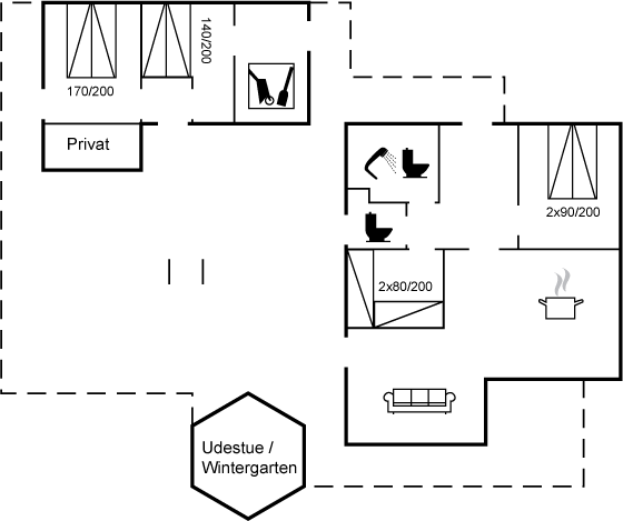 Im Haus findest du zwei Schlafzimmer, und im Gästehaus, das an die Terrasse des Hauses angrenzt, befinden sich zwei weitere Schlafzimmer. Vom Gästehaus aus sind es nur wenige Schritte über die schöne Terrasse zum Badezimmer im Ferienhaus.