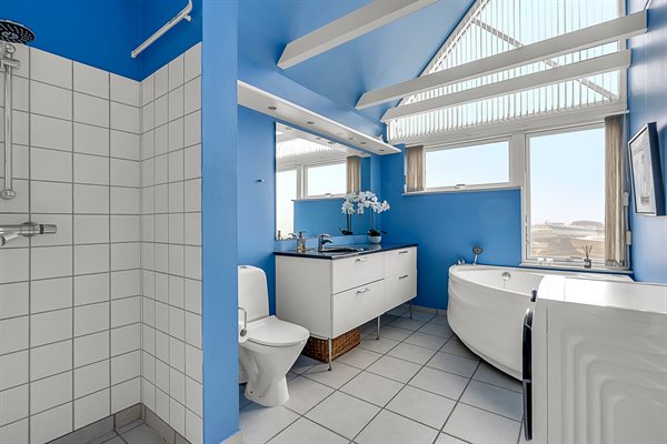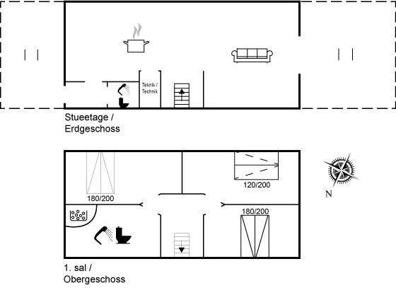 Das Haus erstreckt sich über zwei Etagen: Im Erdgeschoss befinden sich Wohnzimmer, Wohnküche sowie Toilette/Dusch, und im Obergeschoss liegen die Schlafzimmer sowie ein großes Badezimmer mit Whirlpool.