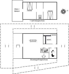 Im Erdgeschoss gibt es u. a. ein großes Kinderzimmer mit 2 großen Etagenbetten und im Obergeschoss gibt es 2 geräumige Schlafzimmer, wo Sie von dem einen Zimmer Zugang zu einem schönen überdachten Balkon mit Loungemöbeln haben.