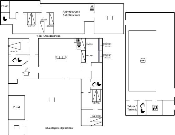 Neben dem Haus befindet sich die große Schwimmhalle, in dem sich unter anderem der große Pool befindet. Beachte, daß der Pool in dem einen Ende 2,5 Meter tief ist und daher Kinder nicht unbeaufsichtigt gelassen werden dürfen. Die Schwimmhalle umfasst auch eine Sauna und ein Badezimmer.