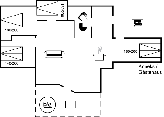 Das Ferienhaus verfügt über eine helle Wohnküche, die in das modern eingerichtete und gemütliche Wohnzimmer übergeht.Es gibt drei Schlafzimmer im Haus – alle mit Doppelbetten. Im großen und gemütlichen Gästehaus, den ihr über die Garage erreicht, befindet sich ebenfalls ein Doppelbett.
