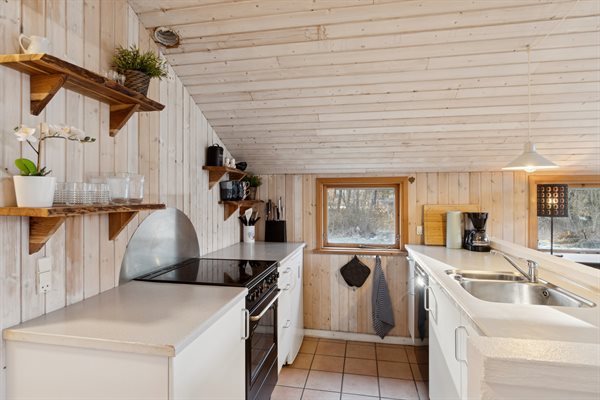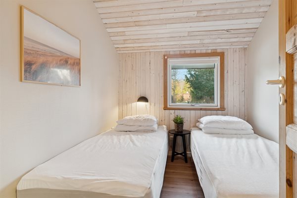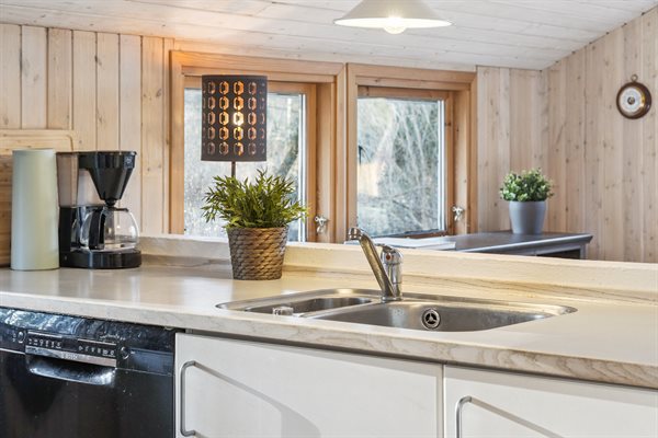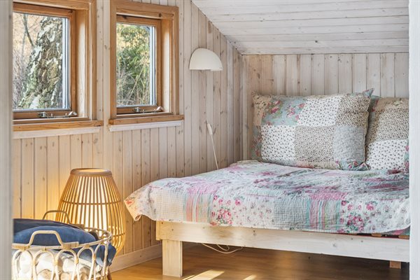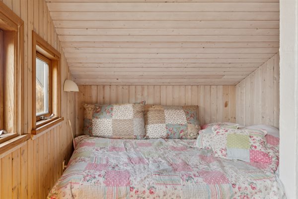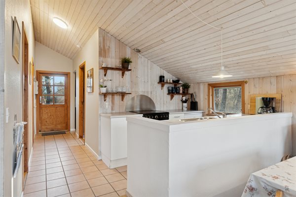 Die offene Küche ist mit dem Essbereich und dem Wohnzimmer verbunden, von wo aus du Zugang zum Garten und zur Terrasse hast – die teilweise überdacht ist. Das Haus verfügt über 2 Schlafzimmer: eines mit Doppelbett und eines mit 2 Einzelbetten. Zusätzlich gibt es 2 Schlafplätze in einem Alkoven im Wohnzimmer. Das Badezimmer ist mit Fußbodenheizung und einer Duschnische ausgestattet. Im Hauswirtschaftsraum findest du die Waschmaschine sowie den Kühlschrank.