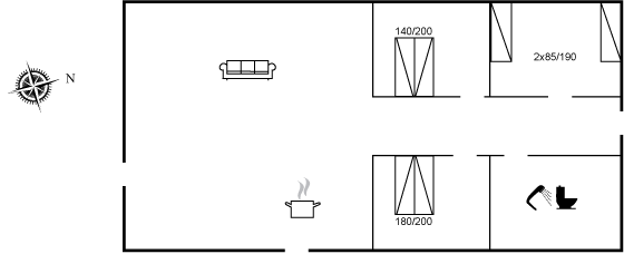Es gibt drei Schlafzimmer mit jeweils zwei Schlafplätzen, und von allen Schlafzimmern aus hast du direkten Zugang zum Grundstück. Zwei der Schlafzimmer sind mit Doppelbetten ausgestattet, das dritte mit zwei Einzelbetten (85 x 190 cm), die sich besonders gut für Kinder oder Jugendliche eignen. Das Badezimmer verfügt über eine Duschnische, Fußbodenheizung und eine Waschmaschine.