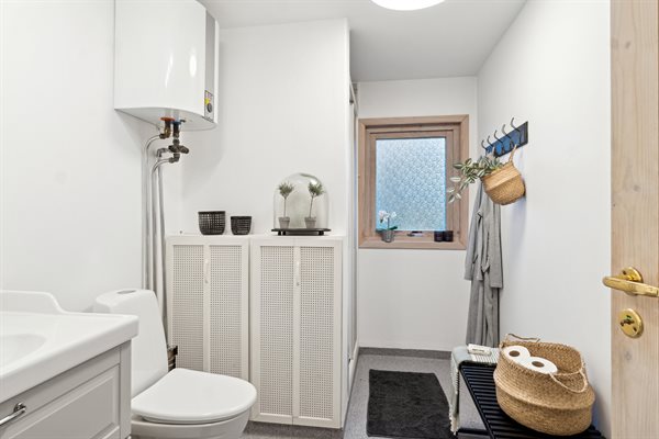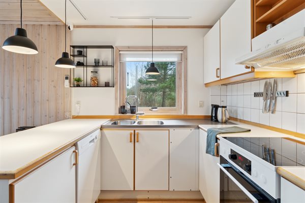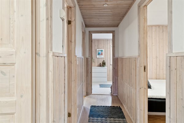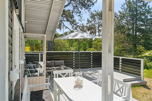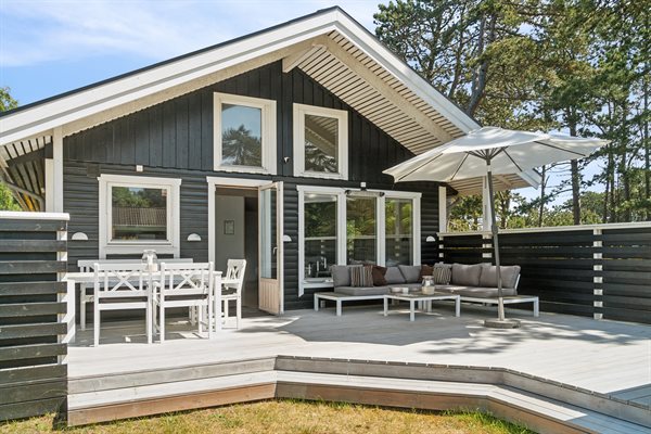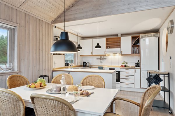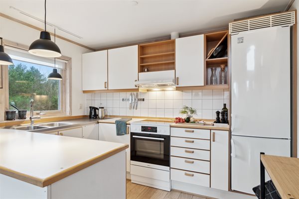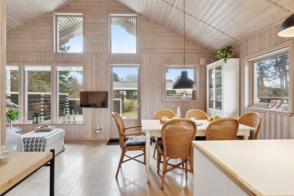 Die Küche ist offen mit dem Essbereich und dem Wohnzimmer verbunden, und dank der großen Deckenhöhe und der vielen großen, nach Süden ausgerichteten Fenster gibt es hier jede Menge Licht und Luft. Von hier aus hast du Zugang zu einer großen Holzterrasse, die sich um das Haus bis nach Westen erstreckt. Hier hast du reichlich Gelegenheit, dich zu entspannen und das gute Wetter zu genießen.