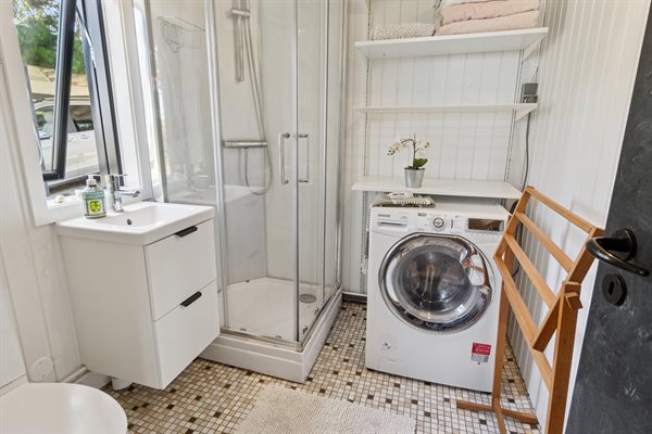 Es gibt ein Badezimmer mit Duschnische und einen Waschtrockner.