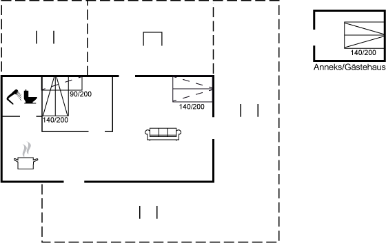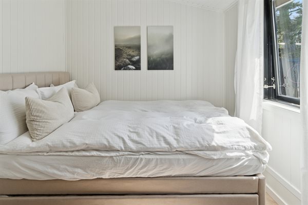 Im Ferienhaus gibt es ein Schlafzimmer mit drei Schlafplätzen – ein Doppelbett und ein Ausziehbett. Außerdem steht dir im Wohnzimmer ein Doppelschlafsofa zur Verfügung. Im Gästehaus, das etwa 17 Meter vom Haupthaus entfernt liegt, findest du ein weiteres Doppelbett.