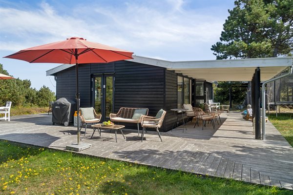 Das Haus besteht aus einem offenen Wohnbereich mit Wohnzimmer, Essplatz und Küche in einem. Von hier aus gelangst du direkt auf die große Holzterrasse, die sich über drei Seiten des Hauses erstreckt. Auf der Südseite findest du eine große überdachte Terrasse, auf der du Schatten und Windschutz findest.