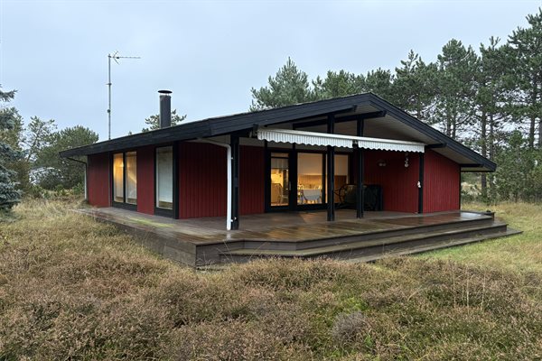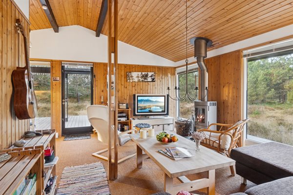 Das Haus ist mit einem offenen Wohnbereich eingerichtet, der Wohnzimmer, Essbereich und Küche vereint. Von hier hast du Zugang zur Holzterrasse, von der ein Teil überdacht ist.