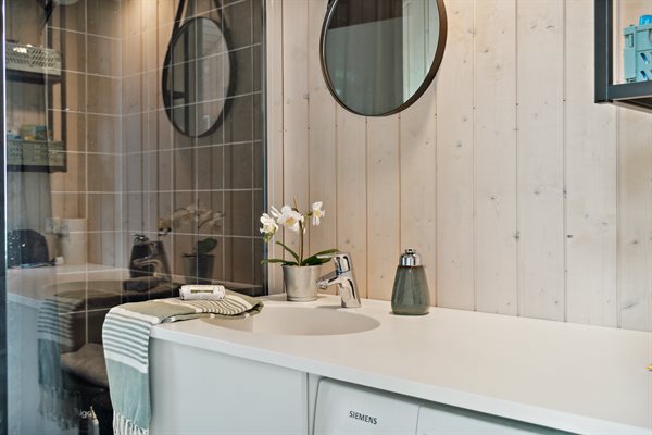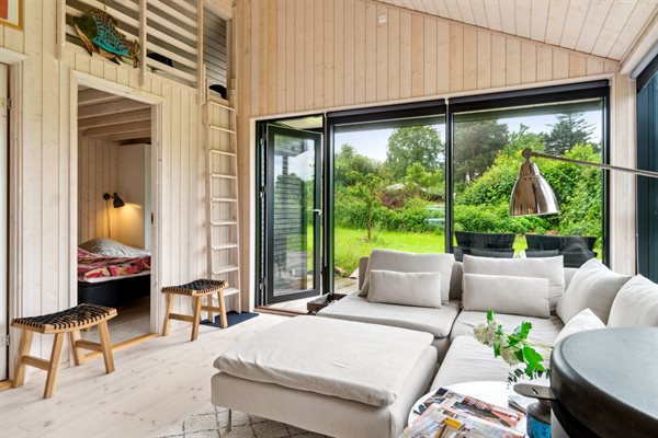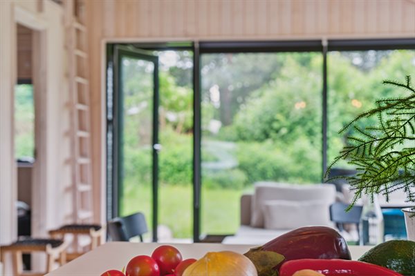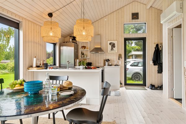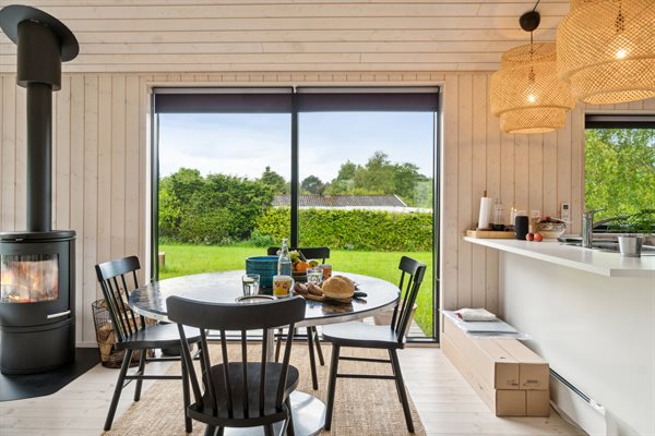 Die großen Fensterpartien sorgen für viel Licht und mit einem offenen Dachraum ist das Haus luftig, geräumig und angenehm zum Verweilen. Das Haus ist modern und sommerlich eingerichtet mit einer offenen Küche, die mit dem Wohnzimmer verbunden ist, und von dem aus hat man Zugang zum nach Süden und Westen ausgerichteten Terrassenbereich, von dem ein Teil überdacht ist. Im Garten gibt es reichlich Spielmöglichkeiten, darunter ein Trampolin. Das Haus wird energieeffizient mit einer Luft-Luft-Wärmepumpe beheizt, und für Gemütlichkeit sorgt ein Kaminofen.