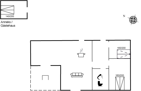 In der Wohnküche gibt es eine Schlafnische zum Entspannen. Das Haus verfügt über 2 Schlafzimmer mit je 2 Schlafplätzen. Von einem der Schlafzimmer gelangt man direkt auf die Terrasse und zu den Außenduschen. Die restlichen 2 Schlafplätze befinden sich im gemütlichen Gästehaus.