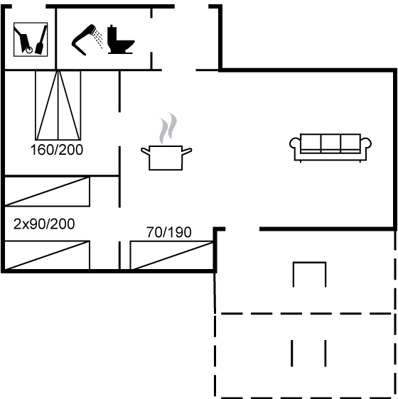 Das Ferienhaus hat ein kombiniertes Wohnzimmer und Küche, wo sich auch ein Einzelbett mit den Maßen 70x190 befindet. Zwei gemütliche Schlafzimmer – ein Zimmer mit zwei Einzelbetten und ein Zimmer mit einem 160x200 Bett. Im Haus gibt es eine Luft/Luft-Wärmepumpe, die gut heizt. Außerdem gibt es sowohl eine offene als auch eine überdachte Terrasse.