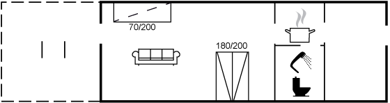 Die Wohnung verfügt über eine kleine Küche mit Kühlschrank und zwei Kochplatten, ein Wohnzimmer mit Zugang zu einer eigenen Terrasse, auf der du dein Mittagessen oder morgens eine Tasse Kaffee genießen kannst. Im Wohnzimmer findest du außerdem ein Doppelbett und eine Schlafcouch – die Wohnung ist daher für ein Paar oder eine kleine Familie mit einem Kind geeignet. Der Eingangsbereich, die Küche und der kleine Essbereich sind separat gelegen, sodass man sich gut in der Wohnung verteilen kann – perfekt, wenn du etwas Ruhe brauchst, ein gutes Buch lesen oder einfach entspannen und deinen Urlaub genießen möchtest.