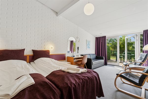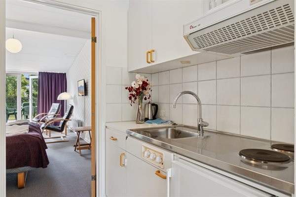 Die Wohnung verfügt über eine kleine Küche mit Kühlschrank und zwei Kochplatten, ein Wohnzimmer mit Zugang zu einer eigenen Terrasse, auf der du dein Mittagessen oder morgens eine Tasse Kaffee genießen kannst. Im Wohnzimmer findest du außerdem ein Doppelbett und eine Schlafcouch – die Wohnung ist daher für ein Paar oder eine kleine Familie mit einem Kind geeignet. Der Eingangsbereich, die Küche und der kleine Essbereich sind separat gelegen, sodass man sich gut in der Wohnung verteilen kann – perfekt, wenn du etwas Ruhe brauchst, ein gutes Buch lesen oder einfach entspannen und deinen Urlaub genießen möchtest.