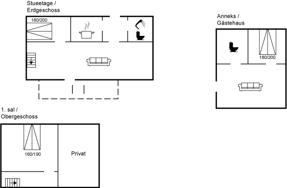 Das Haus erstreckt sich über zwei Etagen, und im Gästehaus auf der anderen Seite des Hofes befindet sich ein neuer Schlafbereich. Wenn ihr Ruhe und Erholung sucht, dann ist dieses Haus genau das Richtige – abgeschieden, und dennoch nicht weit von Årsdale oder Svaneke entfernt.