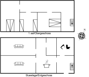 Die Wohnfläche des Hauses verteilt sich auf 2 Geschosse, mit Schlafzimmer im Obergeschoss und Wohnzimmer, Küche und Bad im Erdgeschoss.