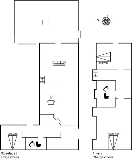 Im Fernsehzimmer gibt es verschiedene Spielkonsolen und einen großen Fernseher mit Smart-TV. Alle Schlafzimmer im Haus haben Doppelbetten und es gibt ein Badezimmer im Erdgeschoss und ein Badezimmer im Obergeschoss. Diese sind mit derselben Seele und demselben Charme eingerichtet wie die übrigen Räume im Haus. Alle Räume haben Fußbodenheizung, die von einer Erdwärmepumpe betrieben wird.