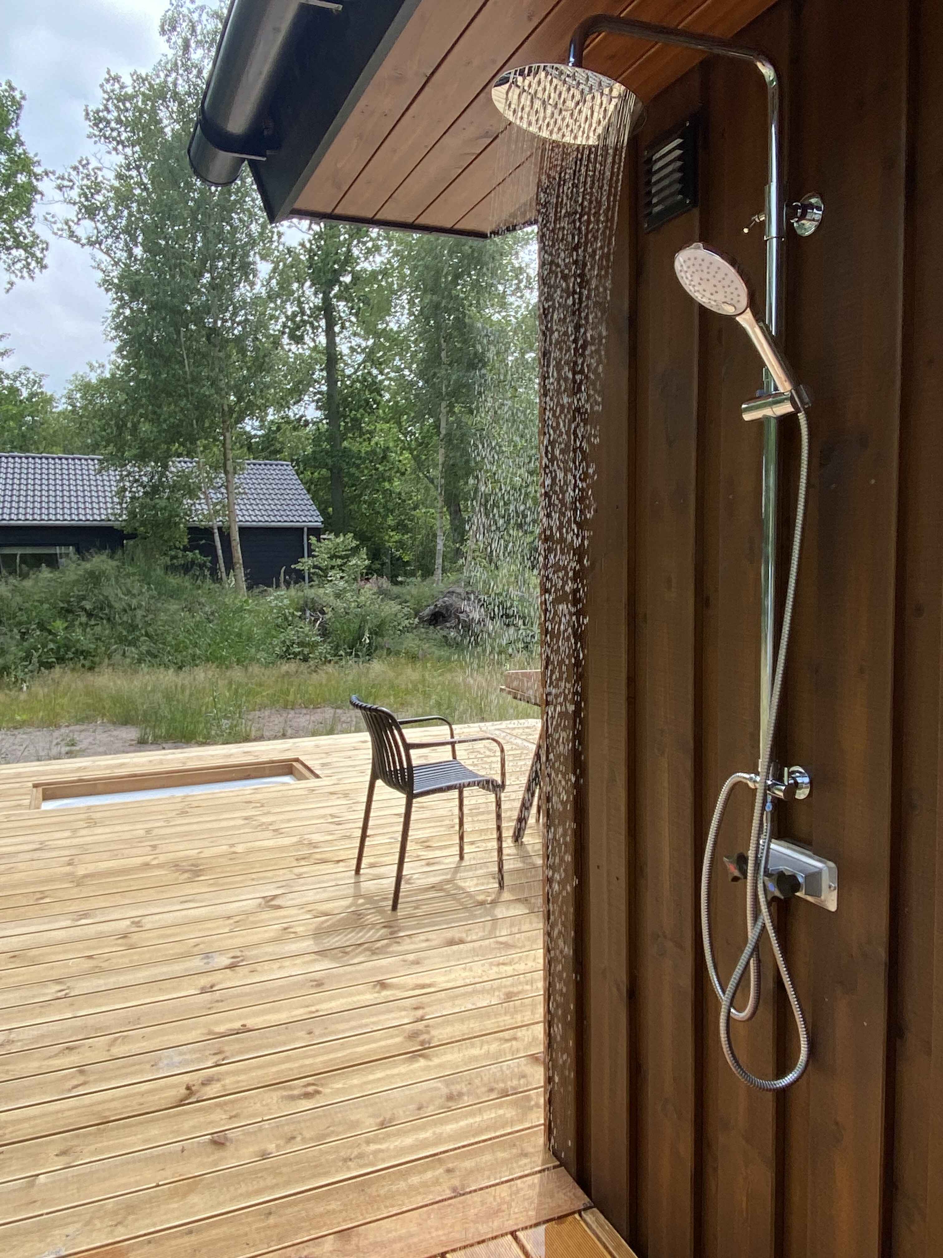 Das Ferienhaus verfügt über eine große Holzterrasse, die dazu einlädt, den Sommer auf dem Loungesofa, gemütliche Momente auf der großen Treppe oder ein Wellnesserlebnis in der integrierten Badewanne zu genießen, die sowohl mit heißem als auch mit kaltem Wasser aus der Außendusche gefüllt werden kann. Auf der Terrasse finden Sie außerdem einen Gasgrill, der frei genutzt werden kann.