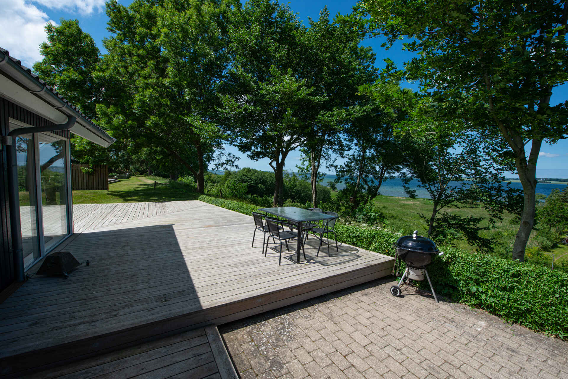 Von der einladenden Holzterrasse aus haben Sie einen unvergleichlichen Panoramablick über das Wasser und ein geschütztes Naturschutzgebiet. Der nach Süden ausgerichtete Bereich bietet Sonne und Schutz mit einem überdachten Bereich. Der Sonnenuntergang von März bis September ist ein Anblick, der jeden fesselt.