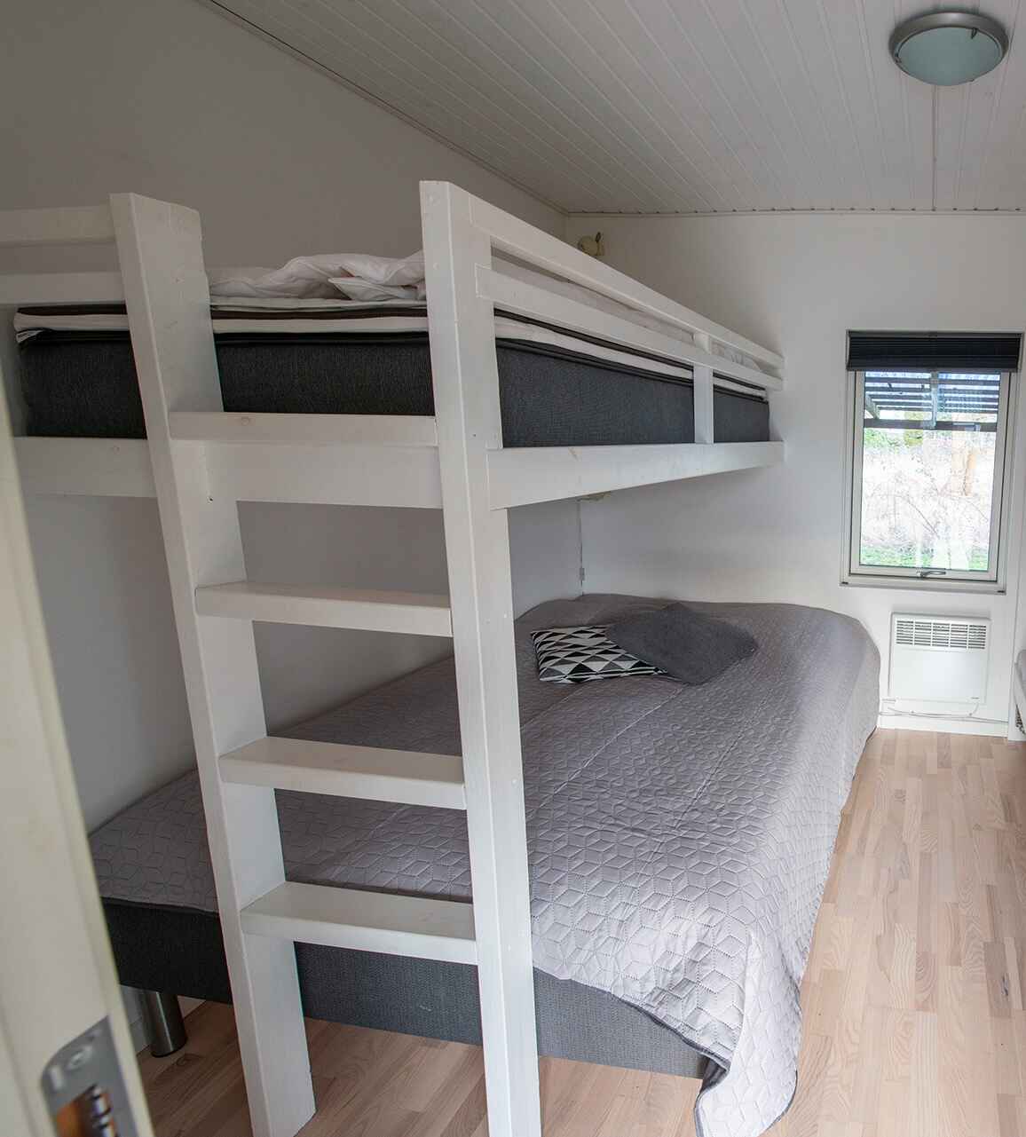 Innen bietet 92 m² einen geräumigen kombinierten Ess- und Wohnbereich. Zwei Schlafzimmer mit Doppelbetten und ein gemütliches Etagenbettzimmer sind ideal für bis zu 6-7 Personen.