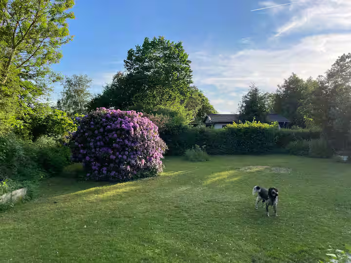 Draußen lädt ein großes, grünes Grundstück zum Spielen, Entspannen und Sonnen ein. Das schöne Badefass ermöglicht gemütliche Abende unter freiem Himmel – zu jeder Jahreszeit.