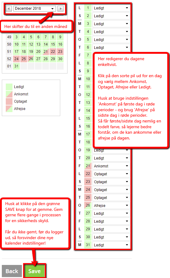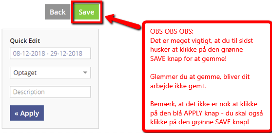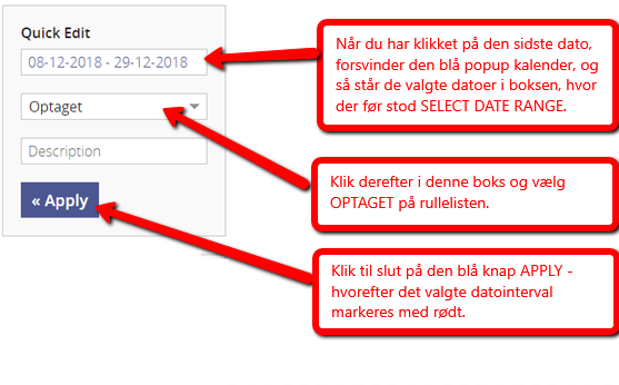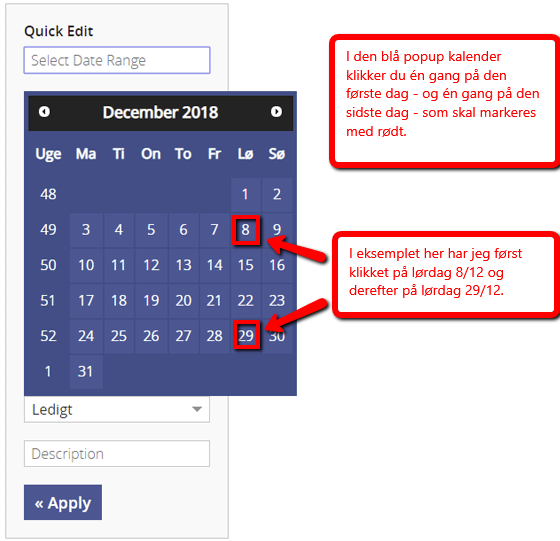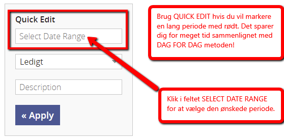 - QUICK EDIT metoden: Hvis du vil markere med rødt for en lang periode - flere uger/måneder - kan du med fordel klikke på den grå knap QUICK EDIT. Du finder QUICK EDIT enten i højre spalte eller øverst/nederst på siden alt efter din skærmstørrelse.