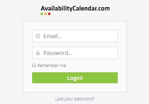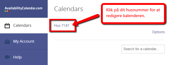 1: Du kan gå direkte til kalender-login her: www.availabilitycalendar.com/login/. Derefter følger du blot nedenstående forklaring. Du kan evt. gemme kalenderlinket på din læseliste eller som et foretrukkent link / bogmærke på din computer, iPad etc.